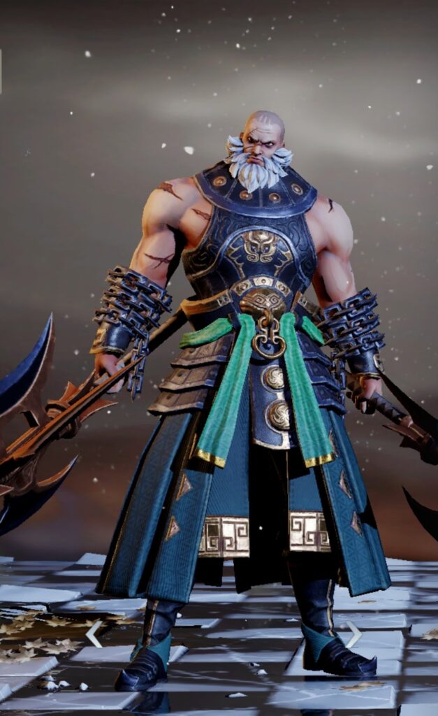 範囲内の敵軍に合計60%の武力ダメージを2回与え、味方武将の防御を50上昇させる。持続時間10秒、武技クールタイム20秒。