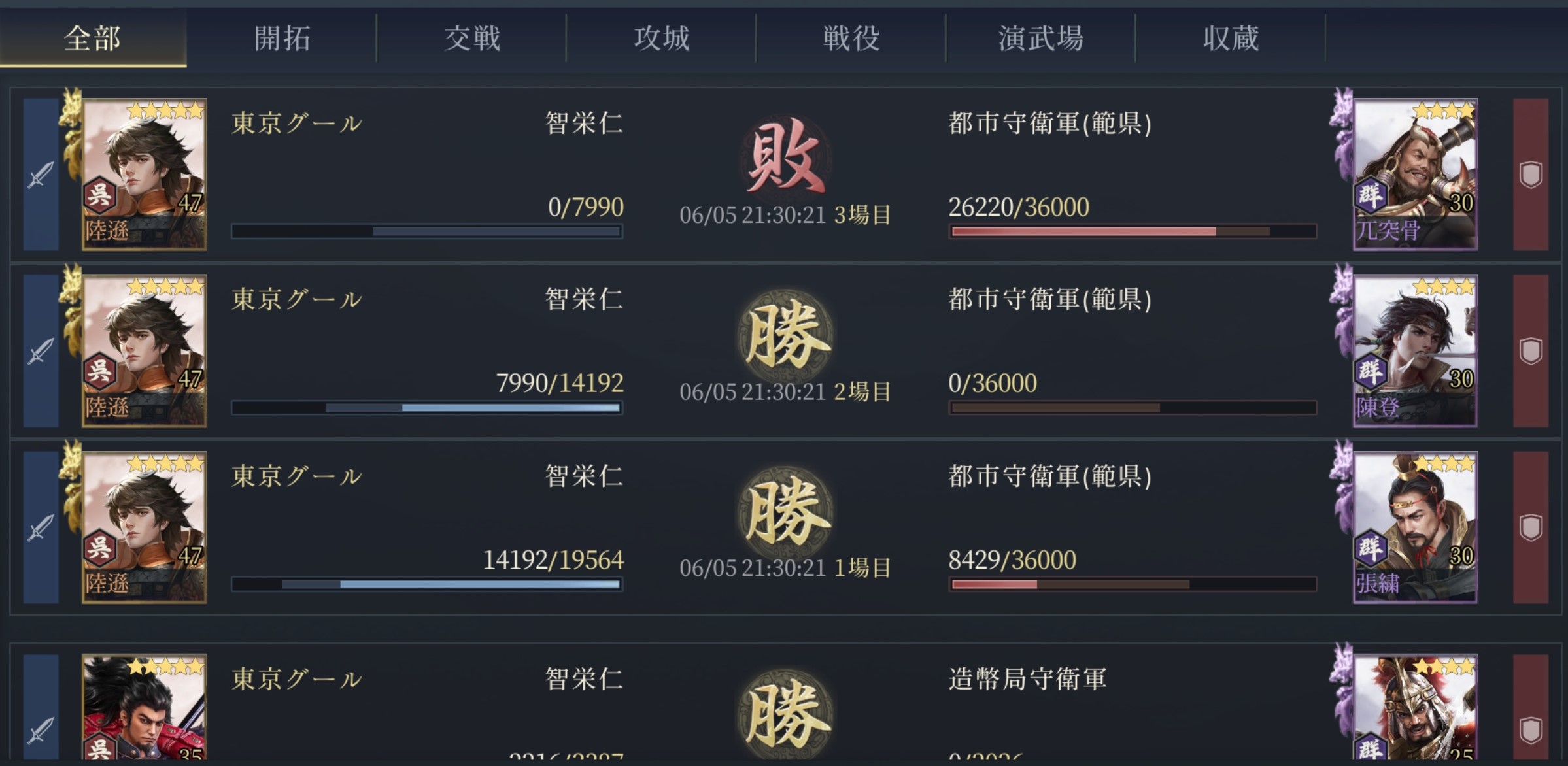 | 将令値:24/25 兵数 :22800 速度 :16 攻城 :120 ボーナス: ・東呉都督 ・陣営(呉) | ![]() 陸遜 Lv47 | ![]() 周瑜 Lv47 | ![]() 魯粛 Lv44 |