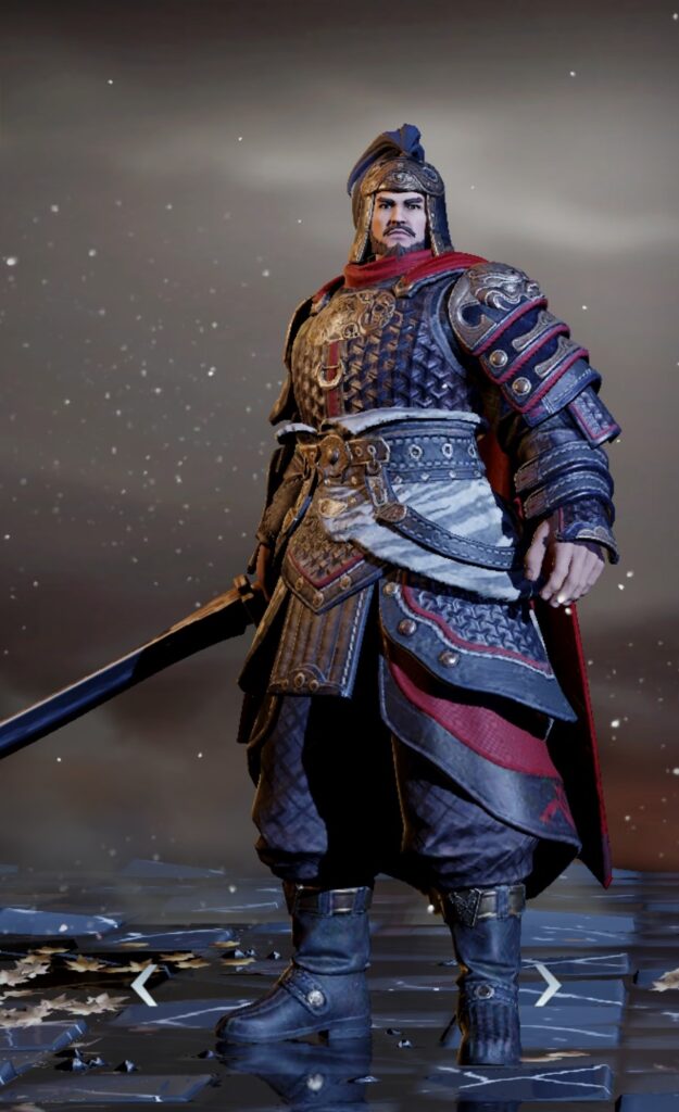 範囲内の敵軍に合計120%の武力ダメージを与え、自身の防御を100上昇させる。持続時間10秒、武技クールタイム20秒。