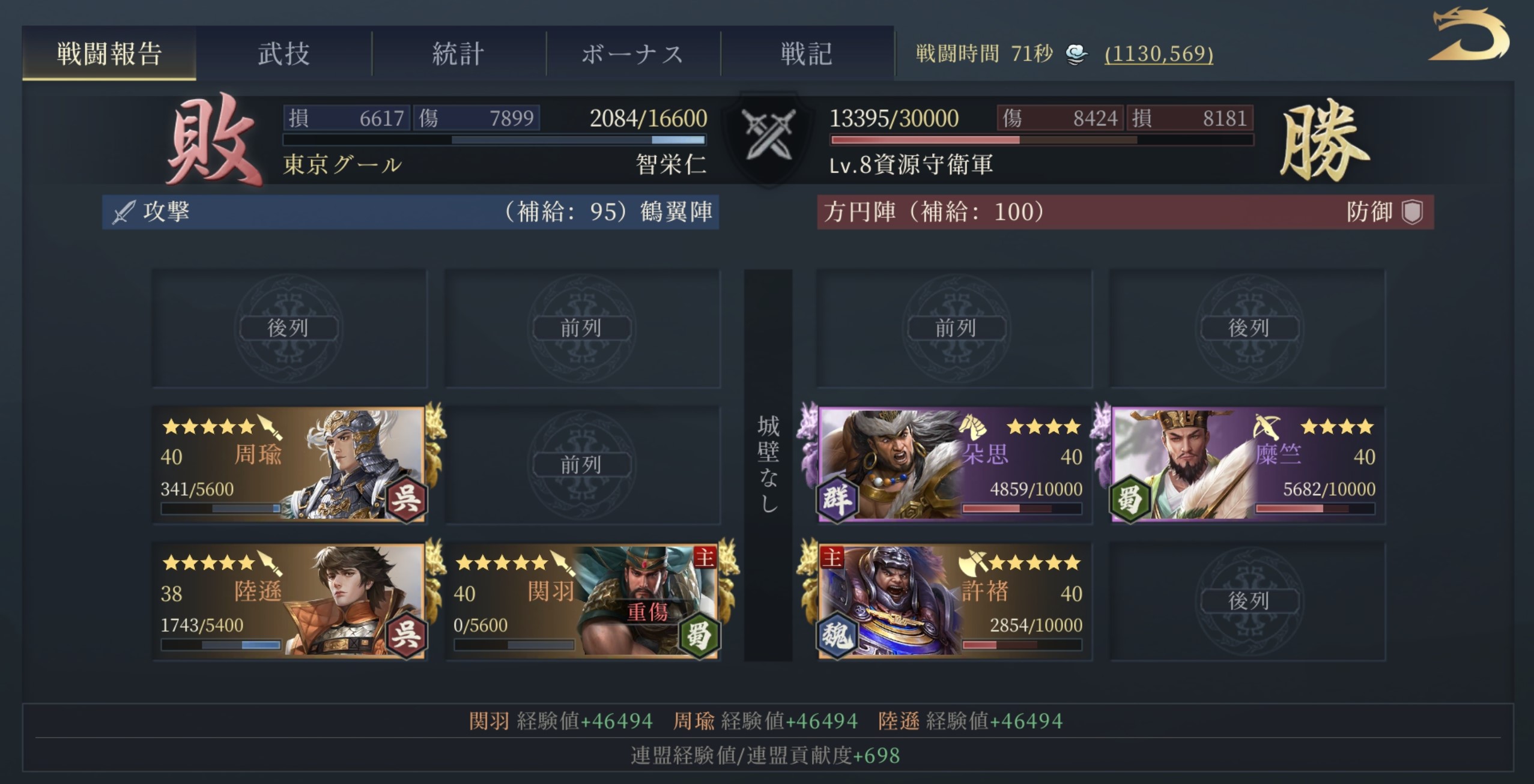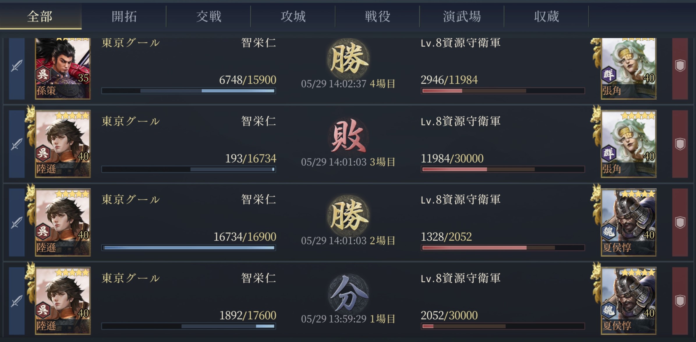 土地レベル7についてはほとんど一軍の1回攻撃で攻略できるようになりました。陸遜と周瑜のコンビネーションはなかなか強力です。関羽が仕事する間もなく相手を撃破していることが少なくありません。