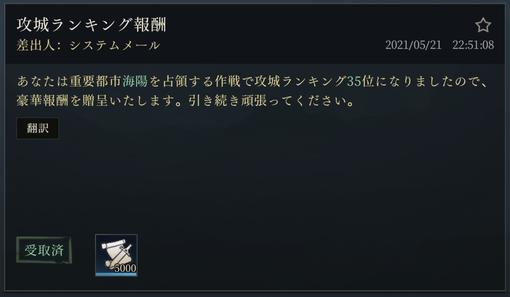 - 攻城戦で初めてランキングに入って報酬を受ける