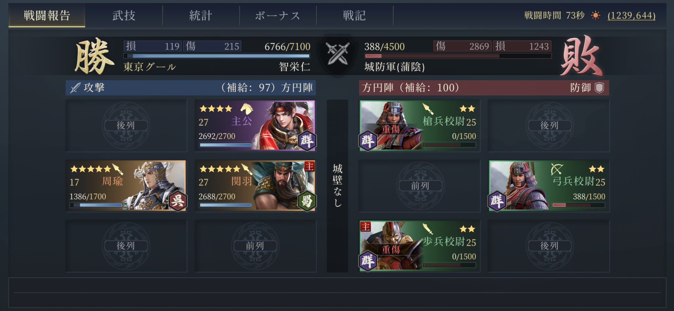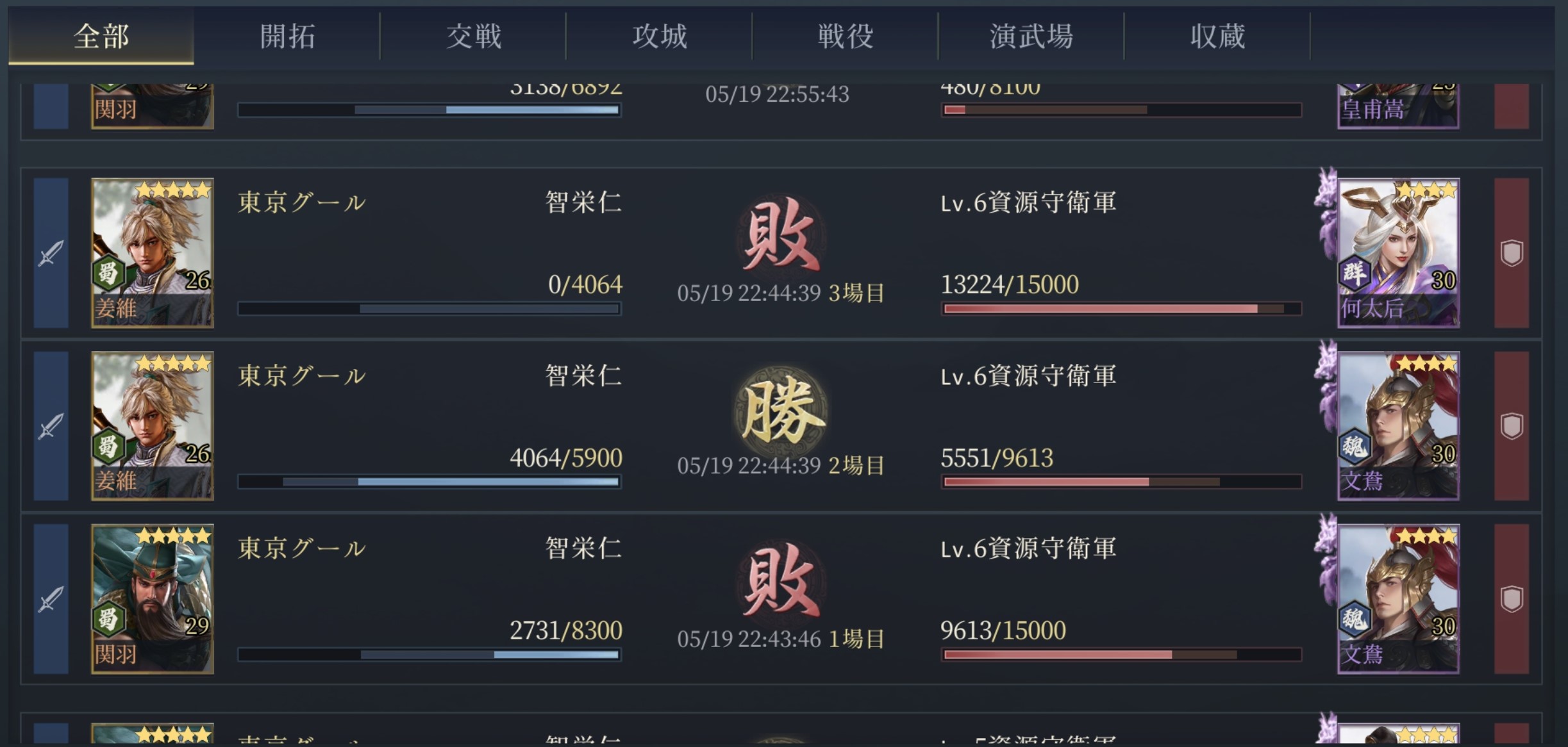 試しに、土地レベル6にチャレンジしましたが、2軍団で守衛軍がいるのでまだまだ難しい感じです。少なくとも最初の勝負は「勝」にしないとそれより劣る軍団で第2陣が行くので。