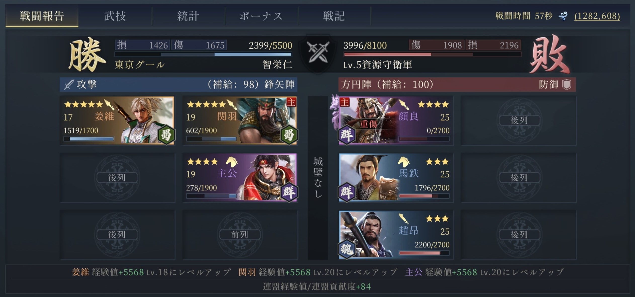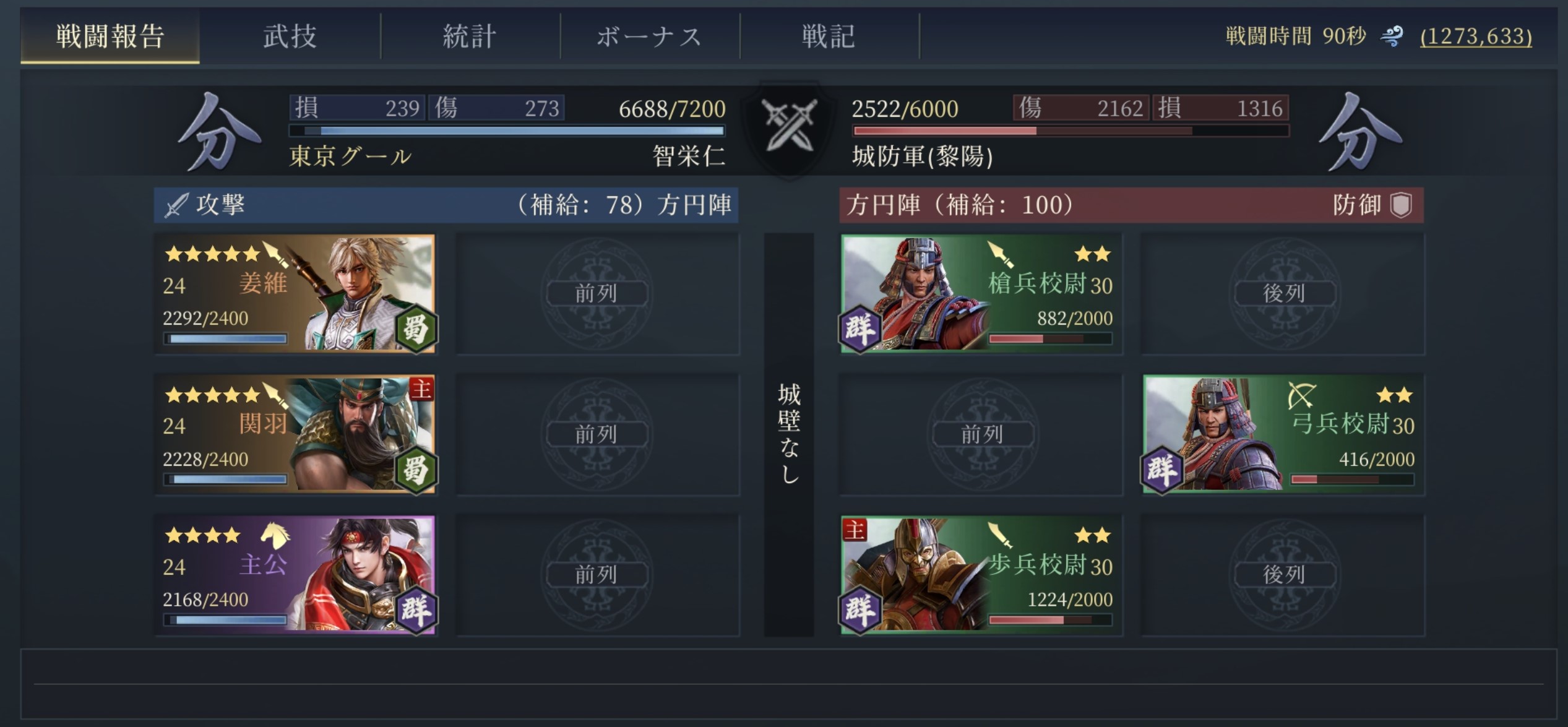 結果は当然、ほとんど役に立ちません。2回ほど戦闘ができて、いずれも引き分けでした。壊滅されたくないから消極的な軍団編成になっているのが、ちょっと恥ずかしいですが。